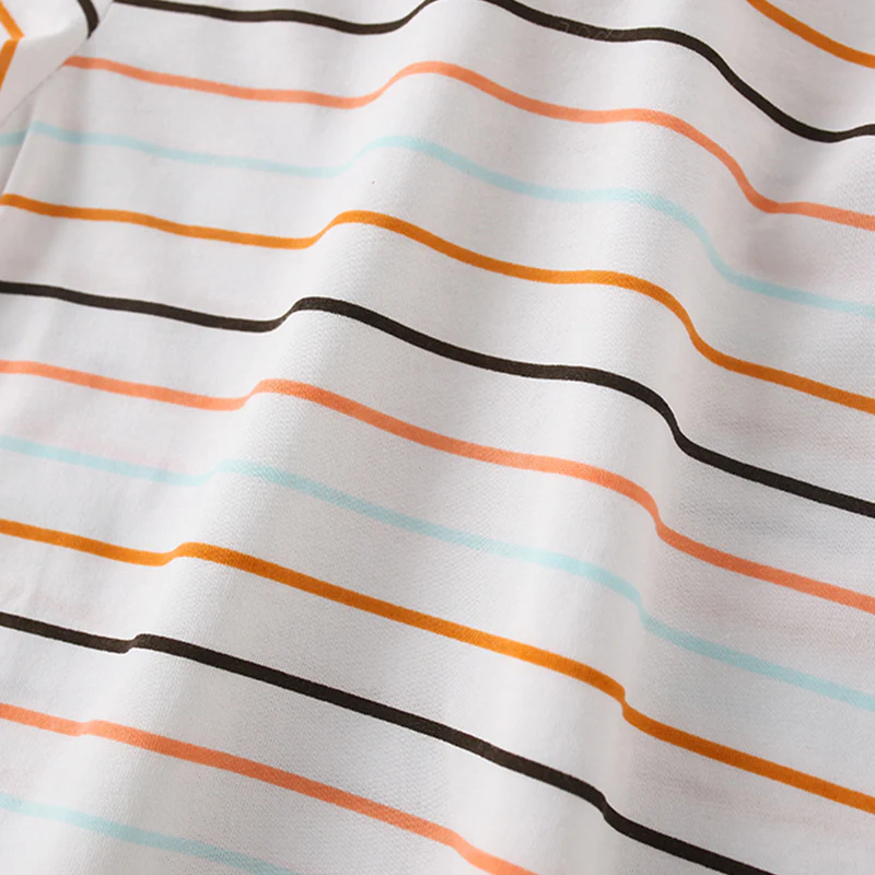 - Afwerking: T-shirt met kleurrijke strepen; oranje shorts met elastische tailleband en witte sportieve rand
