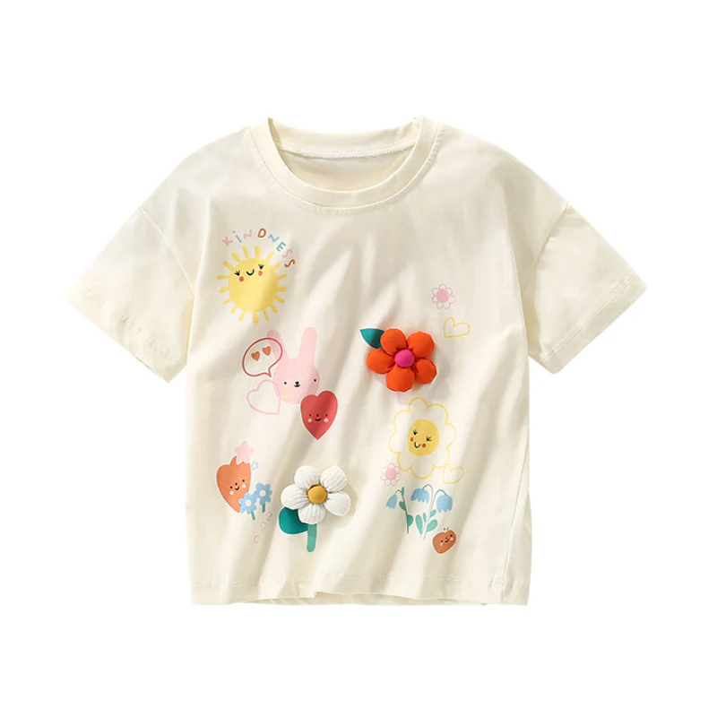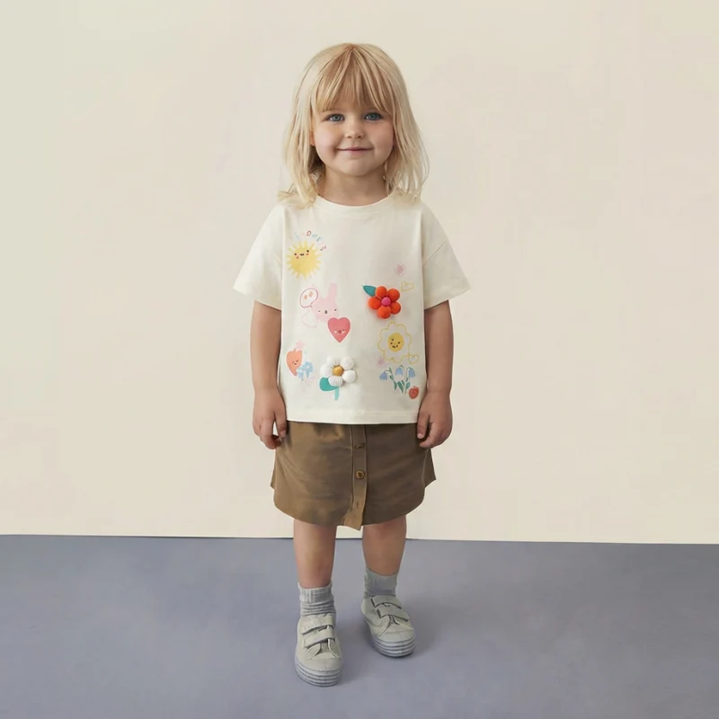 Laat je meisje stralen met Liva, het Gevoerde Karakter T-shirt dat plezier, vriendelijkheid en comfort perfect combineert. Het zachte off-white t-shirt met kleurrijke prints en 3D-gevoerde bloemen maakt elke outfit speels, uniek en vol vrolijkheid. Zo kan je meisje vrij spelen, bewegen en haar persoonlijkheid laten zien terwijl ze zich comfortabel, zelfverzekerd en stralend voelt elke dag.