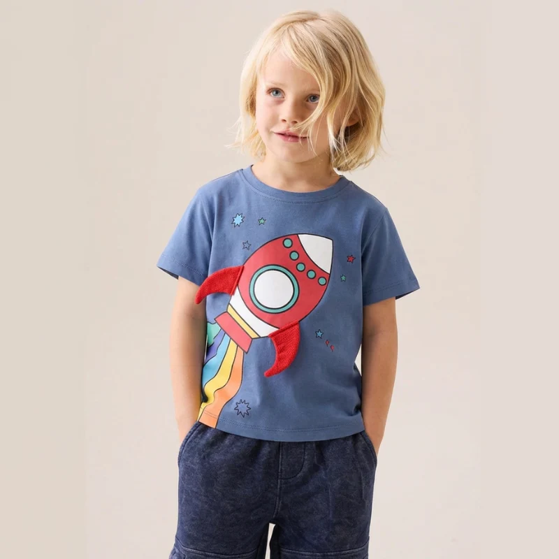 Laat je kind vrolijk spelen, ontdekken en fantaseren over ruimteavonturen met Matej – Rocket Print T-shirt, een speels shirt dat perfect past bij zonnige dagen vol energie en plezier!
