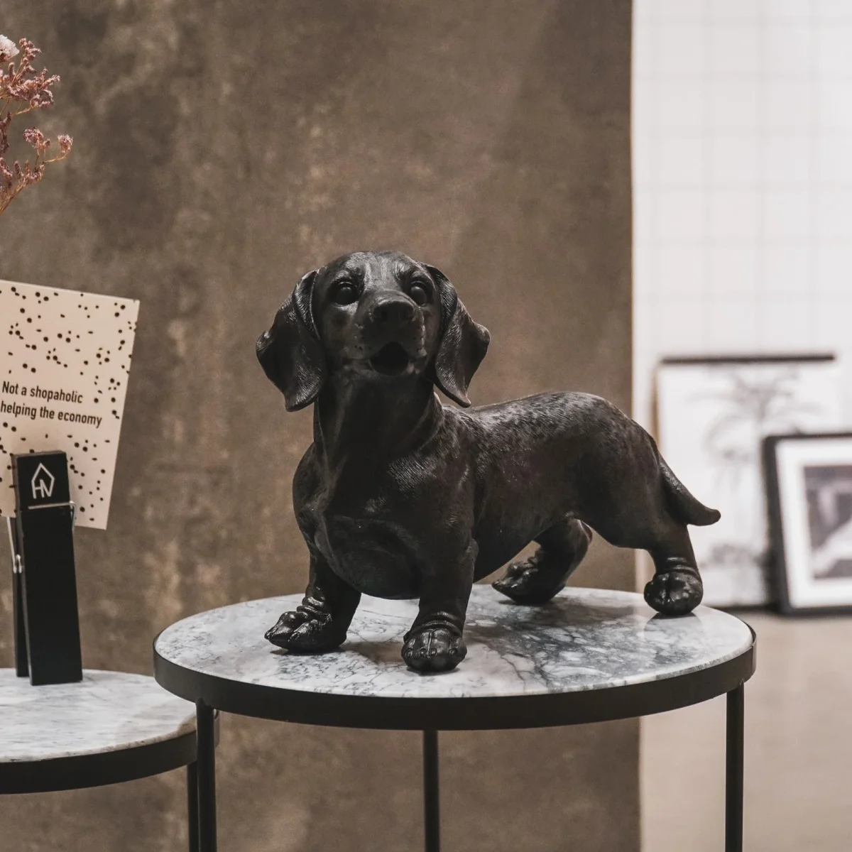 Geef je interieur een elegante twist met dit matzwarte teckelbeeld van stevig polyresin. Met zijn strakke vormgeving en compacte formaat is hij zowel een verfijnd decoratief stuk als een conversation starter. Of je nu een modern, industrieel of minimalistisch interieur hebt, dit hondenbeeld past moeiteloos.