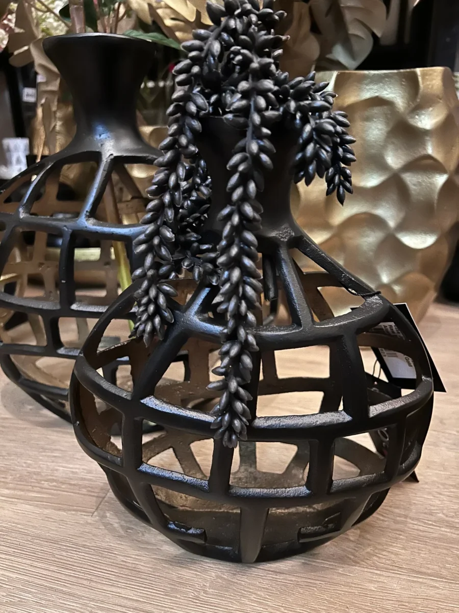 Ontdek de kracht van contrast met de Jalidaar vaas in zwarte uitvoering van Colmore. Deze opengewerkte aluminium vaas combineert robuuste elegantie met een moderne touch. De matte zwarte finish en het unieke patroon maken hem een stijlvolle blikvanger – perfect voor kunstbloemen of puur als kunstobject.